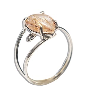 Anel Gota Pedra Rutilo no Quartzo Prata 950 Aro Ajustável, Pedra Rutilo Dourado Incrustado no Quartzo Cristal Gema Gota Cabochão Lisa Natural de garimpo, com lapidação manual aro ajustavel ao dedo serve do 10 ao 30 Prata de lei.
