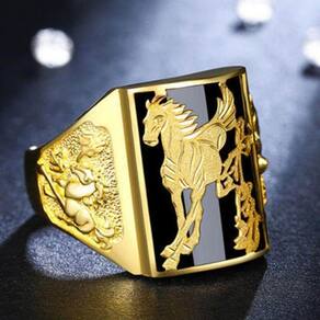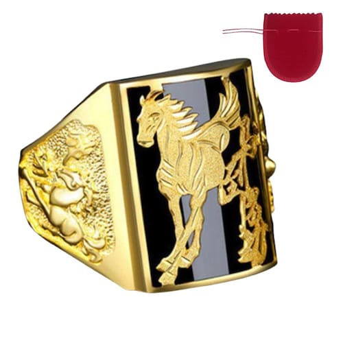 Anel Grande Masculino Cavalo Preto Banhado A Ouro Ajustável