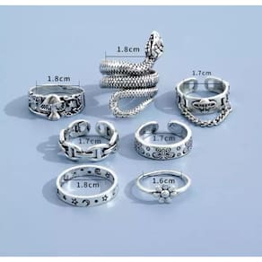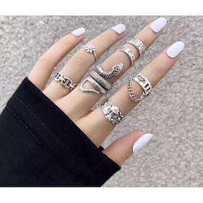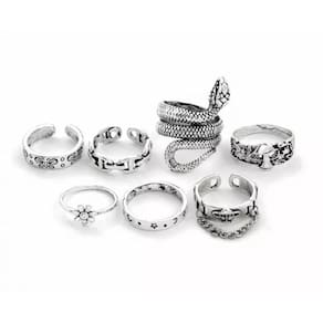 Anel kit 7 peças prateado cogumelo serpente flor corrente lua J0466