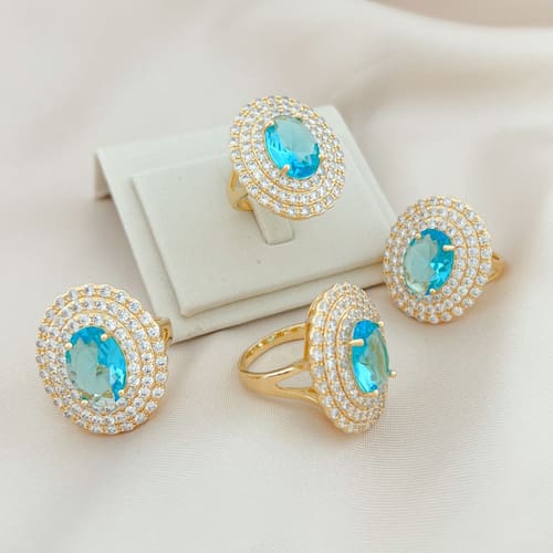 Anel Max Pedra Aqua e Zircônias Cristais Banhado a Ouro