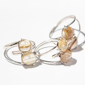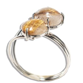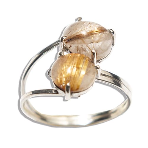 Anel Nlux 2 Gemas Pedra Rutilo Natural Prata 950 aro Ajustável, Pedra Rutilo Dourado Incrustado no Quartzo Cristal Duas Gemas Cabochão Disco e um Cabochão Oval Liso Natural de garimpo, com lapidação manual aro ajustavel ao dedo serve do 10 ao 30 Prata de lei.