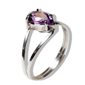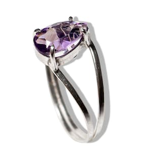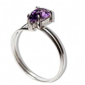 Pedra: Ametista natural, lapidada em forma de gota facetada, destacando seu brilho encantador. Tamanho da Pedra: Aproximadamente 7 x 5 mm. Corte: Gota facetada que reflete a luz de maneira intensa, realçando a cor e o brilho da ametista. Montagem: Prata 950 de alta qualidade, com garra que oferece firmeza e um acabamento luxuoso. Cor da Pedra: Roxo profundo, com reflexos vívidos que aumentam a beleza da lapidação. Aro: Ajustável para um encaixe confortável, adaptável a diferentes tamanhos. Peso Total: Aproximadamente 8 ct (variações podem ocorrer devido ao trabalho artesanal).
