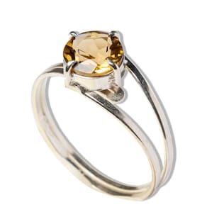 Pedra: Citrino natural, lapidado no formato de disco facetado. Tamanho da Pedra: Aproximadamente 7 mm de diâmetro. Corte: Disco facetado que maximiza o brilho e o jogo de luz sobre a pedra. Montagem: Garra em Prata 950, proporcionando durabilidade e um acabamento luxuoso. Cor da Pedra: Amarelo dourado intenso, com reflexos que evocam luz e calor. Aro: Ajuste confortável, disponível em tamanhos variados. Peso Total da Joia: Aproximadamente 9 ct (variações podem ocorrer devido à lapidação artesanal).