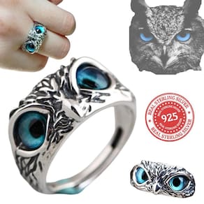 Anel prata 925 coruja olho azul ajustável Anel ajustável em prata esterlina 925 coruja com olhos realistas azuis.