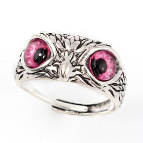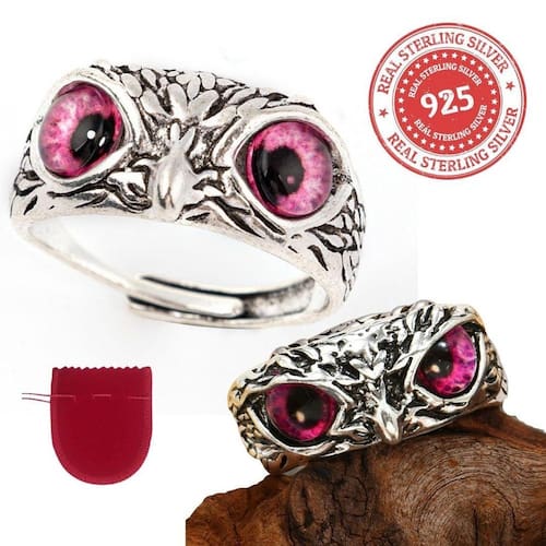 Anel prata 925 coruja sabedoria olho rosa ajustável Anel ajustável em prata esterlina 925 coruja com olhos realistas
