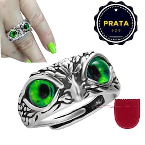 Anel prata 925 coruja sabedoria olho verde ajustável Anel ajustável em prata esterlina 925 coruja com olhos realistas verdes.