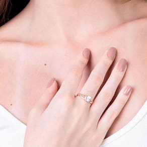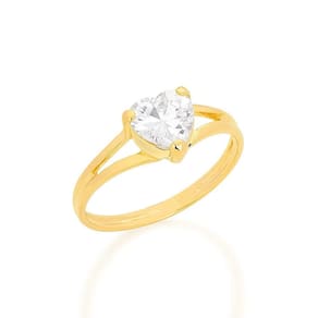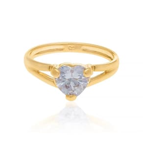 Anel solitário formado por zircônia facetada no formato coração e detalhes vazados.