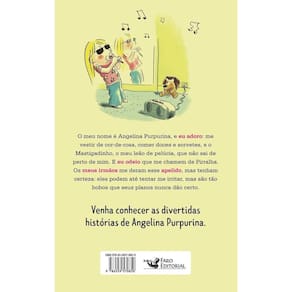Venha conhecer as divertidas histórias de Angelina Purpurina! O meu nome é Angelina Purpurina, e as coisas que eu adoro são: me vestir de cor-de-rosa, comer doces e sorvetes, e o Mastigadinho, o meu leão de pelúcia, que não sai de perto de mim. E eu odeio que me chamem de Pirralha. Os meus irmãos me deram esse apelido, mas tenham certeza: eles podem até tentar me irritar, mas são tão bobos que seus planos nunca dão certo. Angelina é inteligente, divertida e sabe o que quer. Numa casa com dois irmãos mais velhos, ela precisa de muita estratégia e bom humor para conseguir escapar da zoação deles.As aventuras de Angelina Purpurina sempre trazem histórias engraçadas, de uma protagonista simpática que sabe como lidar com os irmãos mais velhos. Angelina Purpurina é uma série com 14 livros, que podem ser lidos fora da ordem e vai encantar os jovens leitores