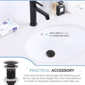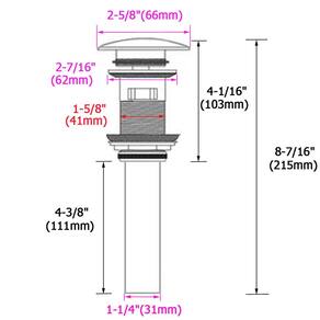 Características: 1. Este ralo de pia de lavatório é feito de latão pesado e genuíno e é de qualidade excepcional. 2. É um dreno estilo botão de pressão; basta pressionar a parte superior do pop-up para fechar, e outra pressione para abrir. 3. Este ralo é "estilo de transbordamento" para uso com pias padrão e penteadeiras que têm um orifício de transbordamento na parte superior da tigela da pia. 4. O ralo padronizado serve para pias de banheiros, vasos e barras molhadas ou qualquer pia com um orifício de drenagem de 4,5 cm a 5 cm de diâmetro (serve para quase todas as pias). 5. A saída de drenagem, ou tubo de resíduo, tem tamanho padrão de 3,8 cm, embora estes drenos também possam ser utilizados com armadilhas de 3,8 cm e bucha. Especificação Peso líquido: 300 g. (315 g) Acabamento: bronze polido a óleo Transbordamento: com orifício de transbordamento Material do ralo superior: latão sólido Material do tubo inferior: aço inoxidável Tamanho do Item Diâmetro do tubo inferior: 3,17 cm Diâmetro da flange superior: 66 mm (2-5/8") Altura total: 8-7/16" (215 mm) com pop-up aberto, 8-1/16" (205 mm) com fecho pop-up Aplicar a: pia de banheiro padronizada/pia de vaso com furo de sobrefluxo Encaixe do orifício de drenagem: orifício de drenagem de 41 mm (diâmetro mínimo), serve para orifícios de drenagem de 41 mm a 5 cm de diâmetro. Para mais informações de tamanho, consulte a segunda imagem mostrada nesta página. Incluído na embalagem: 1 ralo de pia. Peças e juntas de montagem Dicas: recomendamos usar massa de encanador ao redor da flange superior ao instalar para uma melhor vedação firme. Alerta quente 1. Este produto é projetado para ser utilizado na pia com orifício de transbordamento (o que significa que há um orifício na parte superior da pia para evitar transbordamento). 2. Verifique se a sua pia tem um transbordamento ou não e leia atentamente a dimensão do produto antes de comprar. - Alternativa conveniente: ralo de pia de substituição funcional para o mecanismo de tração tradicional, basta pressionar a rolha para vedar ou drenar a água. - Não é fácil de entupir: cesta de filtro dentro para coletar cabelo ou artigos diversos, evita que os itens descarreguem no ralo, pode ser desparafusado para limpeza. - Estrutura sólida e de qualidade: feita de rolha de latão sólido com peça traseira de aço inoxidável para durabilidade, acabamento de bronze polido a óleo premium, resiste à ferrugem, corrosão e manchas. - Tamanho padrão serve para a maioria das pias: aplique em pias padrão de montagem inferior do banheiro ou pias de vaso que tenham sobrecarga, diâmetro do orifício de drenagem necessário: 3,8 cm a 5 cm, o diâmetro da flange superior é de 6,3 cm. - TODAS AS PEÇAS INCLUÍDAS, SEM VAZAMENTO: todas as peças necessárias incluídas para fácil instalação, junta de borracha para melhor vedação firme, sem vazamento se instalar corretamente.