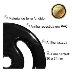 Anilha Emborrachada 5 Kg Preta para Halteres Cor: Preto Anilhas de Ferro revestida em PVC , tendo um Furo central de 30 a 34mm. Compatíveis com Barras e aparelhos Padrões.