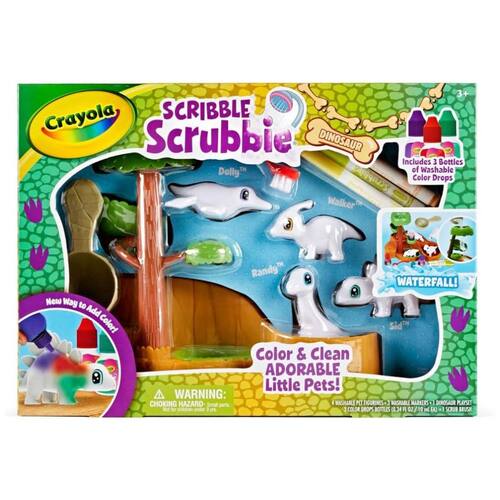 Este conjunto de toboágua Scribble Scrubbie Dinosaurs é perfeito para as crianças que amam dinossauros Com este conjunto, elas podem criar seus próprios amigos dinossauros personalizados usando gotas coloridas e marcadores laváveis incluídos. Além disso, as tintas laváveis facilitam a limpeza dos dinossauros e das mãos das crianças. Este conjunto é uma ótima alternativa aos livros para colorir de dinossauros e brinquedos de pelúcia, proporcionando uma maneira divertida de emocionar seu filho e estimular sua imaginação O conjunto inclui 1 ambiente de cachoeira, 4 animais de estimação dinossauros, 3 frascos coloridos e 1 escova de limpeza. Para mais amigos animais, colete pacotes de expansão Scribble Scrubbie adicionais vendidos separadamente. Lembre se de usar apenas marcadores Crayola UltraClean para seus animais de estimação Scribble Scrubbie. Este conjunto é um ótimo presente de Natal para meninos e meninas a partir de 3 anos.