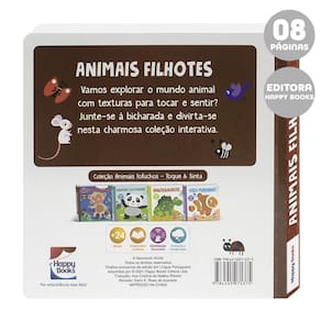 Animais fofuchos toque e sinta: animais filhotes happy books vamos explorar o mundo animal com texturas para tocar e sentir Junte-se à bicharada e divirta-se nesta charmosa coleção interativa, toque nos animais e sinta incríveis texturas, as ilustrações são super coloridas e alegres características: - habilidades: desenvolve a leitura, habilidades sensoriais e estimula a imaginação; - dimensões: 18 x 18cm; - número de páginas: 08 páginas; - faixa etária: a partir de 24 meses; - acabamento: cartonado com recurso toque e sinta; -imagens meramente ilustrativas- atenção: a cor do produto pode variar de acordo com o monitor atenção: o fabricante pode alterar a cor de alguma parte do produto sem aviso prévio. Homologação Inmetro: IP-BRI-0904/2021-02 Ean: 9786555071375