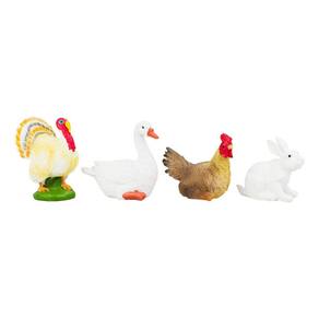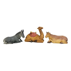 Enfeite decorativo na imagem dos animais do Presépio com 12 peças, sendo o boi deitado a peça maior com 18,5 cm de comprimento. As peças que formam os animais são: bode, coelho, 2 ovelhas, peru, ganso, carneiro, porco, galo, camelo, boi e burro. Tamanhos proporcionais a peça mais comprida. Material: resina