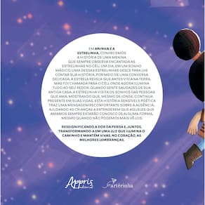 Em Aninha e a Estrelinha, conhecemos a história de uma menina que sempre observa encantada as estrelinhas no céu. Um dia, em um sonho mágico, uma dessas estrelinhas desce para lhe contar sua história. Por meio de uma conversa delicada, a Estrela revela que antes vivia na Terra, mas foi chamada para o céu, onde agora ilumina tudo ao seu redor. Quando sente saudades de sua antiga casa, a Estrelinha visita os sonhos das pessoas que ama, mostrando que, mesmo de longe, continua presente em suas vidas. Esta história sensível e poética traz uma mensagem reconfortante sobre a ausência, ajudando as crianças a entenderem que aqueles que amamos sempre estarão conosco de alguma forma, mesmo quando não podemos mais vê-los. Ressignificando a dor da perda e, juntos, transformando-a em uma luz que ilumina o caminho e mantém vivas, no coração, as melhores lembranças.
