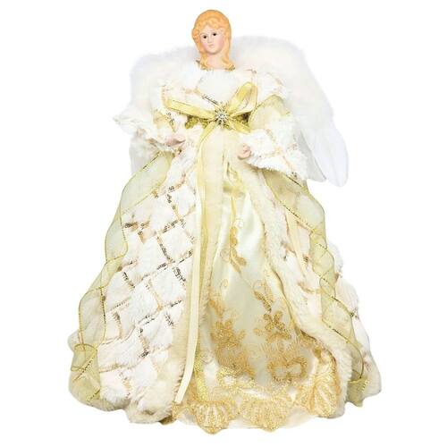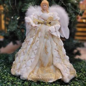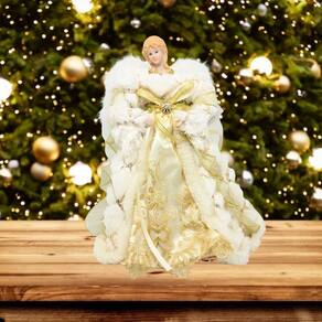 -01 Unidade Anjo Decorativo Ponteira de Árvore de Natal Luxo 40cm, Roupa Felpuda branco Luxo com Detalhes Dourado