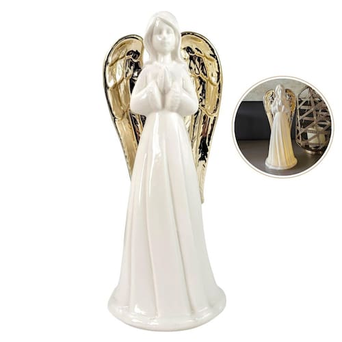 Anjo Decorativo Porcelana Branco Dourado 29cm Decoração Led Estátua de Anjo de Porcelana Branco e Dourado com LED Inigual Decor Adicione um toque de paz, elegância e luz à sua decoração com esta Estátua de Anjo de Porcelana com LED da Inigual Decor. Esta peça é perfeita para simbolizar a serenidade e a beleza, criando um ambiente acolhedor e mágico em qualquer espaço da sua casa. Confeccionada em porcelana branca, a estátua possui um design clássico com delicadas asas na cor dourada, conferindo um visual sofisticado e atemporal. A figura do anjo, em uma serena postura de oração, exala calma e tranquilidade. A iluminação de LED embutida projeta uma luz suave e acolhedora, destacando a peça e criando uma atmosfera de contemplação. Com 29 cm de altura, ela tem o tamanho ideal para se destacar com elegância em mesas, prateleiras ou lareiras. As pilhas já estão inclusas, permitindo que você a utilize imediatamente para iluminar sua decoração. É a escolha ideal para quem busca uma peça de alta qualidade que une a beleza da porcelana ao simbolismo celestial e à magia da iluminação. Por Que Escolher a Estátua de Anjo Inigual Decor Design Clássico: A porcelana branca e os detalhes dourados criam um visual elegante e atemporal. Simbolismo de Paz: A figura do anjo em oração transmite serenidade, ideal para qualquer época do ano. Iluminação Acolhedora: Os LEDs internos proporcionam um brilho suave e convidativo. Praticidade de Uso: Com as pilhas inclusas, a peça está pronta para ser Utilizado. Material de Alta Qualidade: A porcelana garante que a peça seja durável e com acabamento refinado. Especificações do Produto: Altura Aproximada: 29,0 cm Largura Aproximada: 12,5 cm Profundidade Aproximada: 11,5 cm Peso Aproximado: 735 g Material: Porcelana e LED Cor: Branco com asas douradas Conteúdo da Embalagem: 1 Estátua de Anjo de Porcelana com LED Pilha inclusa Importante: Limpe delicadamente com um pano macio e seco. Observação: As imagens são ilustrativas. Itens decorativos adicionais exibidos nas fotos não acompanham o produto. Marca: Não Informado