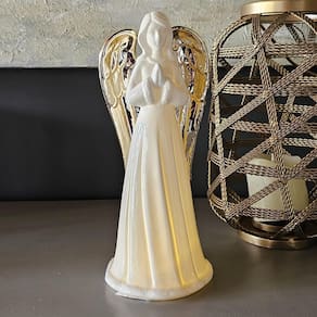 Anjo Decorativo Porcelana Branco Dourado 29cm Decoração Led Estátua de Anjo de Porcelana Branco e Dourado com LED Inigual Decor Adicione um toque de paz, elegância e luz à sua decoração com esta Estátua de Anjo de Porcelana com LED da Inigual Decor. Esta peça é perfeita para simbolizar a serenidade e a beleza, criando um ambiente acolhedor e mágico em qualquer espaço da sua casa. Confeccionada em porcelana branca, a estátua possui um design clássico com delicadas asas na cor dourada, conferindo um visual sofisticado e atemporal. A figura do anjo, em uma serena postura de oração, exala calma e tranquilidade. A iluminação de LED embutida projeta uma luz suave e acolhedora, destacando a peça e criando uma atmosfera de contemplação. Com 29 cm de altura, ela tem o tamanho ideal para se destacar com elegância em mesas, prateleiras ou lareiras. As pilhas já estão inclusas, permitindo que você a utilize imediatamente para iluminar sua decoração. É a escolha ideal para quem busca uma peça de alta qualidade que une a beleza da porcelana ao simbolismo celestial e à magia da iluminação. Por Que Escolher a Estátua de Anjo Inigual Decor Design Clássico: A porcelana branca e os detalhes dourados criam um visual elegante e atemporal. Simbolismo de Paz: A figura do anjo em oração transmite serenidade, ideal para qualquer época do ano. Iluminação Acolhedora: Os LEDs internos proporcionam um brilho suave e convidativo. Praticidade de Uso: Com as pilhas inclusas, a peça está pronta para ser Utilizado. Material de Alta Qualidade: A porcelana garante que a peça seja durável e com acabamento refinado. Especificações do Produto: Altura Aproximada: 29,0 cm Largura Aproximada: 12,5 cm Profundidade Aproximada: 11,5 cm Peso Aproximado: 735 g Material: Porcelana e LED Cor: Branco com asas douradas Conteúdo da Embalagem: 1 Estátua de Anjo de Porcelana com LED Pilha inclusa Importante: Limpe delicadamente com um pano macio e seco. Observação: As imagens são ilustrativas. Itens decorativos adicionais exibidos nas fotos não acompanham o produto. Marca: Não Informado