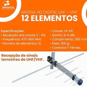 Garanta uma recepção de alta qualidade para todos os canais abertos! Apresentamos a Antena HD Digital 12 Elementos, desenvolvida para captar sinais UHF e VHF com máxima eficiência. Compatível com os canais 2 a 69, esta antena oferece ganho de 8 a 9 dBi e alcance ampliado, ideal para áreas com sinais moderados a fracos.