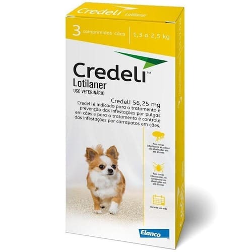 Credeli 56,25mg para cães de 1,3 a 2,5kg é um comprimido mastigável, pequeno e saboroso, que atua rapidamente para proteger cães filhotes e adultos contra carrapatos e pulgas por um mês inteiro. Credeli fornece atividade imediata e persistente por pelo menos 30 dias na eliminação de pulgas (ctenocephalides felis e ctenocephalides canis) e carrapatos (rhipicephalus sanguineus, ixodes ricinus, ixodes hexagonus, ixodes scapularis, dermacentor reticulatus, dermacentor variabilis, amblyomma cajennense e amblyomma americanum). Administração: Credeli é um produto pronto para o uso, comercializado em 5 diferentes concentrações. Deve ser administrado de acordo com as informações da tabela a seguir, de forma a garantir a dose de 20 mg a 43 mg de lotilaner/kg de peso corporal. Para cães acima de 45 kg de peso corporal, utilizar uma combinação apropriada de credeli. Deve ser administrado com alimento ou logo após a refeição para melhor absorção. Modo de ação: Seguindo a adm inistração oral, lotilaner é imediatamente absorvido e o pico de concentração sanguínea é alcançado em duas horas. A meia vida da molécula é de aproximadamente 4 semanas. Essa meia vida longa fornece concentrações sanguíneas efetivas para toda a duração do intervalo entre as doses. A principal via de eliminação é a excreção biliar e menos de 10% é por excreção renal. Lotilaner apresenta uma pequena porção metabolizada em mais compostos hidrofílicos, eliminados nas fezes e na urina. Composição (a cada 100mg): - lotilaner: 35,16mg - excipiente q.S.P.: 100,00mg Benefícios: No caso de infestações por carrapatos, credeli começa a eliminar os carrapatos 4 horas após a administração e para novas infestações são eliminados em até 8 horas. Credeli começa a eliminar as pulgas 2 horas após a administração, com eliminação total após 6 horas. Para novas infestações, as pulgas são eliminadas em até 4 horas durante um mês. Credeli pode ser usado como parte do tratamento de dermatite alérgica à picada de pulgas (dapp) e diminui o risco de doenças causadas por parasitas transmitidos pelos carrapatos, como a erliquiose em cães, resultado de sua rápida ação. Credeli elimina as pulgas existentes e as provenientes de novas infestações antes que sejam colocados ovos, devido ao seu rápido início de ação e a sua eficácia de longa duração. Portanto, o produto interrompe o ciclo de vida das pulgas e previne a contaminação ambiental nas áreas em que o cão tem acesso. Advertências: Não utilizar em caso de conhecida hipersensibilidade ao ingrediente ativo ou a qualquer um dos excipientes. Como para qualquer outro produto da classe das isoxazolinas, os parasitas precisam alimentar-se nos hospedeiros para iniciar a exposição ao lotilaner, o que significa que o risco de transmissão de doenças transmitidas por parasitas não pode ser completamente excluído. Estudos de laboratório realizados em ratos não evidenciaram qualquer efeito teratogênico, ou eventos adversos na capacidade reprodutiva de machos ou fêmeas. Informações: - indicação: somente cachorros - idade: filhotes, adultos, idosos - raças: pequenas, médias e grandes Itens que acompanham: - 03 comprimidos credeli 56,25mg (01 caixa). - leia a bula ou informações descritas na embalagem. - consulte sempre o médico veterinário de sua confiança para o uso apropriado deste medicamento.