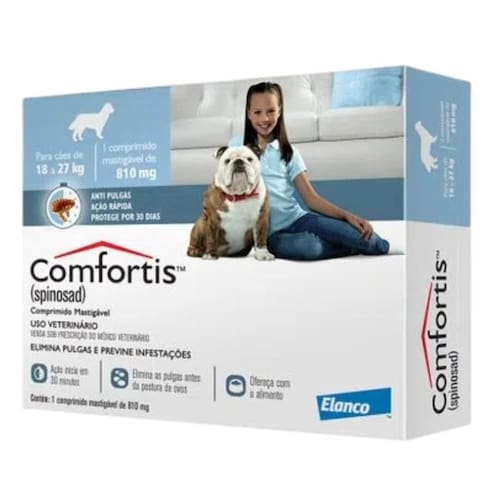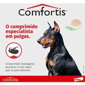 O Antipulgas Comfortis elimina pulgas a atua na prevenção da infestação por um mês, sendo o primeiro comprimido mastigável sabor carne com parovação do fda. Comfortis traz um modo de ação inédito através de seu princípio ativo, o Spinosad. Sua eficácia se dá pela ligação nas terminações nervosas do inseto, levando-o a paralisia e morte em poucos minutos, elimina as pulgas antes da sua produção de ovos. Sua ação inicia em 30 minutos, matando rapidamente as pulgas, proporcionando alivio para seu pet. Comfortis é 100% efetivo em 4 horas, melhorando drasticamente o bem-estar dos cães tratados. Comfortis é indicado para a prevenção e tratamento das infestações de pulgas Ctenocephalides felis por 30 dias, oferecendo o alívio imediato com início de ação em 30 minutos. Cães adultos e filhotes a partir de 14 semanas e com 2,3 kg de peso corporal ou mais.