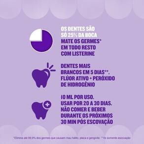 LISTERINE ANTIMANCHAS evita o amarelamento dos dentes e mata os germes que causam mau hálito para um sorriso naturalmente mais branco em 2 semanas* *vs somente escovação Ean: 7702031988250