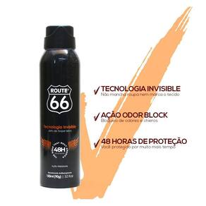 Um desodorante antitranspirante que oferece 48 horas de proteção, para você encara todas as aventuras da Rota 66 sem se preocupar com mau cheiro ou suor. Com tecnologia Invisible e ação Odor Block protege você por muito mais tempo, sem manchar ou deixar suas roupas marcadas, isso com um jato de toque seco e secagem rápida.