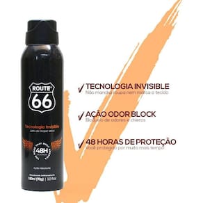 Um desodorante antitranspirante que oferece 48 horas de proteção, para você encara todas as aventuras da Rota 66 sem se preocupar com mau cheiro ou suor. Com tecnologia Invisible e ação Odor Block protege você por muito mais tempo, sem manchar ou deixar suas roupas marcadas, isso com um jato de toque seco e secagem rápida.