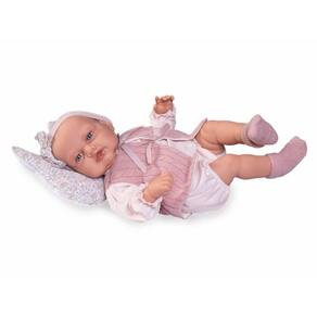 A boneca acompanha tiara, laço de cabelo, blusa de tricô, suéter, shortinho, calça, meias, chupeta com corrente e uma almofada de amamentação/estampada.