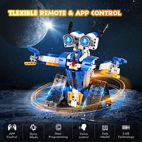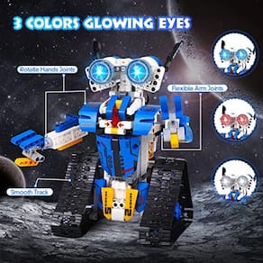 Impressione seus amigos com este modelo incrível! Este característico RC Robot apresenta um esquema de cores cardinal, preto e azul, olhos azuis brilhantes, faixas de trabalho. Este conjunto inclui 351 peças e oferece uma experiência de construção e jogo apropriada para a idade para maiores de 8 anos.