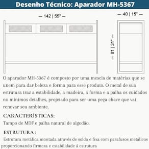 Aparador Mh-5375 Herval 130 Cm Palha Natural Madeira Maciça Amêndoa A linha de móveis da Herval são todos seguindo o certificado FSC que garante que o produto é ecologicamente correto. Itens perfeitos para quem busca conforto e design com um grau extremo de aperfeiçoamento e refinamento, sempre combinando a inovação com a sustentabilidade! O aparador MH-5375 combina o moderno com o contemporâneo. Sua base possui um design que se adapta facilmente a vários estilos de decoração. O metal de sua estrutura traz a estabilidade, a madeira, a forma e a palha são projetadas para ser uma peça chave que vai renovar seu ambiente com seu design. Há outras possibilidades de acabamento para a madeira. Garantia (via): 6 | Produto: Aparador MH-5375 Herval 130 cm Palha Natural Madeira Maciça Amêndoa | Cor: Amêndoa | Materiais: Madeira Maciça, MDF, Palha Natural de Algodão | Tonalidade: Marrom | Estilo de Decoração: Moderno | Linha: MH-5375 | Marca: Herval | Peso Suportado (kg): 100.00 | Atributos: Durável, Resistente, Sofisticado, Elegante | Área de uso: Interna | Garantia (tempo): 6 meses | Peso (kg): 14.50 | Medidas: Largura (cm): 130.00 | Medidas: Profundidade (cm): 42.00 | Medidas: Altura (cm): 75.00 | Entregue Montado?: Sim | Origem do Produto: Nacional | Conservação e Manutenção: Limpeza com pano úmido em solução de água ou detergente neutro. Secar em seguida. | Estado de Origem: RS | Conteúdo da Embalagem: 01 Aparador | Height: 75 CENTIMETERS | Width: 130 CENTIMETERS | SideToSide: 42 CENTIMETERS