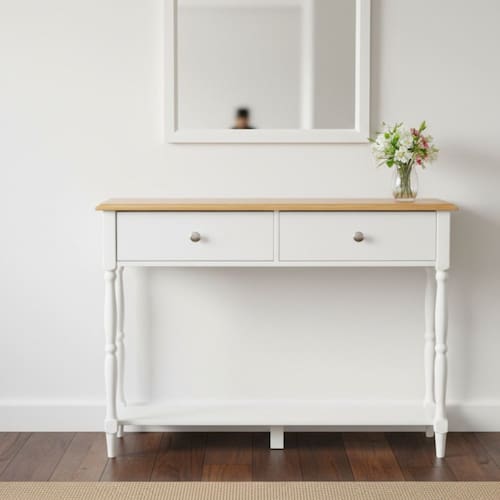 Aparador com design clássico e acabamento sofisticado. Produzido em madeira maciça, que realça os veios naturais. Possui duas gavetas funcionais com puxadores metálicos e prateleira inferior para apoio, é ideal para halls, salas ou quartos, unindo elegância e praticidade em um só móvel.