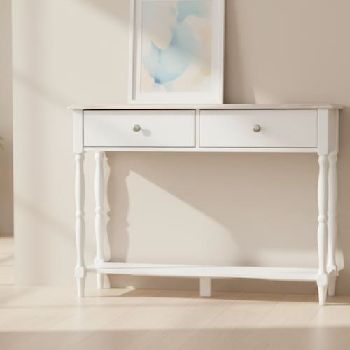 Aparador com design clássico e acabamento sofisticado. Produzido em madeira maciça, que realça os veios naturais. Possui duas gavetas funcionais com puxadores metálicos e prateleira inferior para apoio, é ideal para halls, salas ou quartos, unindo elegância e praticidade em um só móvel.