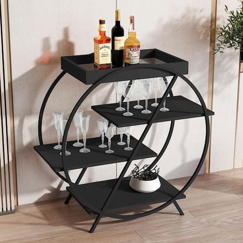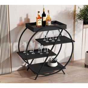 Contém quatro prateleiras para facilitar o armazenamento de garrafas, taças e objetos decorativos, possui espelho na base da bandeja.