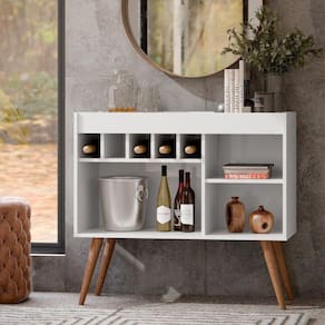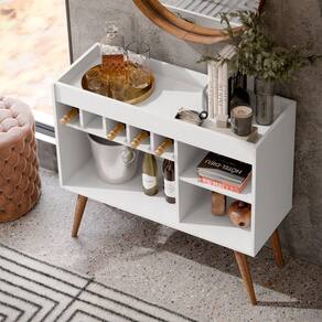O modelo conta com pés em madeira, que garantem firmeza, durabilidade e um toque natural ao ambiente. Possui prateleiras funcionais para organização de itens decorativos, utensílios ou taças, além de espaço dedicado para adega, ideal para armazenar garrafas de vinho com elegância e praticidade.