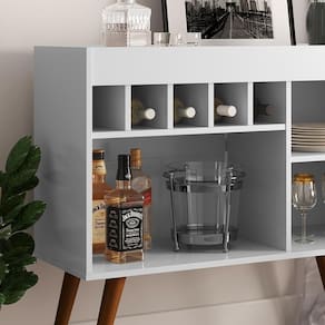 O Aparador Adega Odin - EJ Móveis é a combinação perfeita de elegância e praticidade. Compacto e charmoso, conta com um design retrô graças aos pés palito em madeira maciça, tampo superior estilo bandeja e espaço para armazenar até 5 garrafas em sua adega. Além disso, possui um nicho que facilita a organização e decoração do ambiente, tornando-se a escolha ideal para complementar diversos espaços da casa.