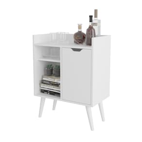 Produzido em MDP de 15mm com acabamento em pintura UV, conta com pés cônicos em PVC de 23cm que conferem leveza e sofisticação ao ambiente. Seu espaço interno é bem distribuído: 1 porta com dobradiças metálicas, 2 prateleiras internas e tampo superior ideal para acomodar bebidas, cafeteiras, utensílios ou itens decorativos.