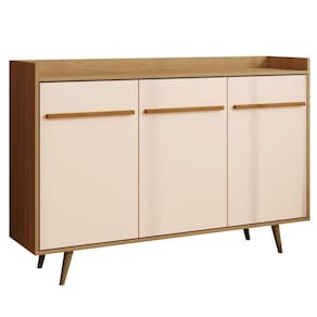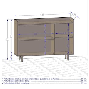 Aparador é elaborado em MDP de 15 mm, possui 3 portas com dobradiças metálicas, 4 pés de madeira maciça, suportando até 32 Kg.