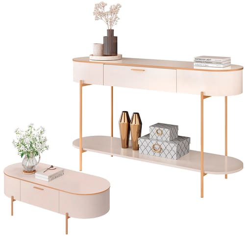 Com uma mesa de centro equipada com uma gaveta discreta, você terá espaço de sobra para organizar seus itens essenciais, enquanto o aparador com uma prateleira e uma gaveta também vai proporcionar a exibição de itens decorativos personalizados. Já os pés metálicos robustos de ambos conferem um toque de estilo industrial, enquanto os cantos arredondados suavizam a estética, criando um ambiente acolhedor e convidativo. Este conjunto completo para sala de estar não é apenas uma peça de mobiliário; é uma declaração de estilo que promete transformar seu ambiente em um refúgio contemporâneo. Afinal, cada detalhe foi pensado para unir funcionalidade e beleza. Entre no clima do design que faz a diferença! Adicione ao seu carrinho!