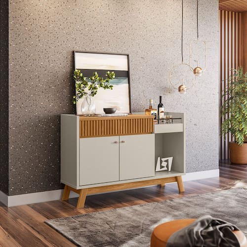 O Buffet Lucca vai encontrar o seu ambiente. Com design moderno, possui um gaveta com detalhe ripado e corrediça telescópica e ainda duas portas de abrir para voce guardar objetos que não precisam ficar à mostra. Possui uma porta bebidas com haste metálica e espelho. Com também com pés estilo retro, trazendo ainda mais elegância para o seu ambiente.