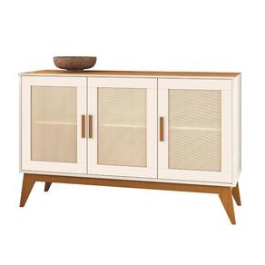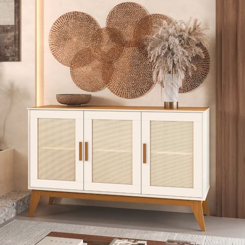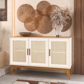 Aparador Buffet 3 Portas com Tela e Pés de Madeira Andorra EDN Móveis, de design contemporâneo, que combina elegância e funcionalidade em cada detalhe. Com estrutura em MDP/MDF, conta com três portas articuladas com dobradiças metálicas e acabamento em Rattan que adiciona charme e textura ao móvel. Os puxadores em madeira maciça complementam o visual sofisticado, enquanto as duas prateleiras internas oferecem espaço ideal para acomodar louças.