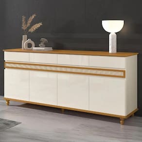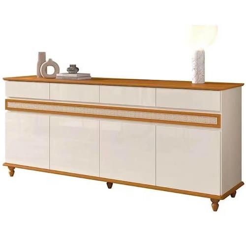 Material: MDP | Cor: Off White | Acabamento: Pintura UV e tela de Rattan sintético | Quantidade do Produto: 1 | Marca: EDN Móveis | Possui Vidro: Não | Possui Rodízio: Não | Material do Tampo: MDF | Possui Pés: Sim | Pés Reguláveis: Não | Quantidade de Porta: 4 | Quantidade de Gavetas: 4 | Material dos Pés: Madeira maciça | Altura: 84 | Largura: 184 | Profundidade: 45 | Peso Suportado: 30 no tampo e 5 cada gaveta | Garantia: 90 dias | Requer Montagem?: Sim | Quantidade de caixas de embalagem: 1 | Inclui manual de montagem: Sim