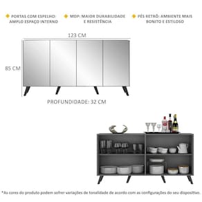 O Aparador Buffet 4 portas com Espelho Retrô Vegas Multimóveis é produzido em MDP, que garante maior durabilidade, facilidade na limpeza, além de um acabamento superior. Com 4 portas, possui acabamento acetinado (cerca de 20% de brilho) e um excelente espaço interno para organizar seus pertences (as prateleiras internas suportam 5 Kg cada e o tampo 10 Kg). Os pés retrô, em polipropileno, e os detalhes com espelhos nas portas dão um charme especial ao móvel deixando-o com um visual leve e permitindo você compor um ambiente com ar vintage e moderno ao mesmo tempo. Os espelhos são de vidro (o que evita que a imagem fique distorcida) e lapidados, ou seja, passam por um processo para que as bordas não fiquem cortantes, o que garante maior segurança. Seu design minimalista, torna o móvel muito versátil, podendo ser utilizado de diversas maneiras e em qualquer ambiente.