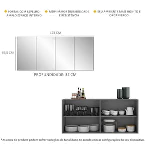 Dimensões do produto montado: Altura: 69,5cm | Largura: 123cm | Profundidade: 32cm *Você pode consultar as medidas internas na imagem técnica do produto.