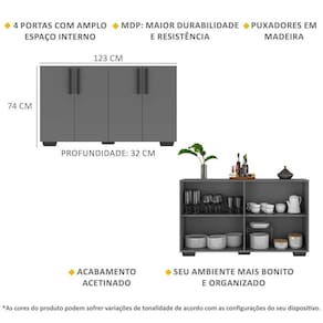 O Aparador Buffet 4 Portas com Pés Quadrados Viena Multimóveis é produzido em MDP com acabamento acetinado (cerca de 20% de brilho), que garante maior durabilidade, além de um acabamento superior. Com 4 portas e puxadores em madeira, possui um excelente espaço interno para organizar seus pertences (as prateleiras internas suportam 5 Kg cada e o tampo 10 Kg). Os pés quadrados, em polipropileno, facilitam na hora da limpeza. Seu design minimalista, torna o móvel muito versátil, podendo ser utilizado de diversas maneiras e em qualquer ambiente.