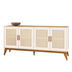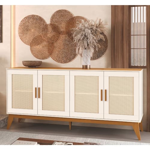 Aparador Buffet 4 Portas com Tela e Pés de Madeira Andorra EDN Móveis, de design contemporâneo, que combina elegância e funcionalidade em cada detalhe. Com estrutura em MDP/MDF, conta com 4 portas articuladas com dobradiças metálicas e acabamento em Rattan que adiciona charme e textura ao móvel. Os puxadores em madeira maciça complementam o visual sofisticado, enquanto as duas prateleiras internas oferecem espaço ideal para acomodar louças.