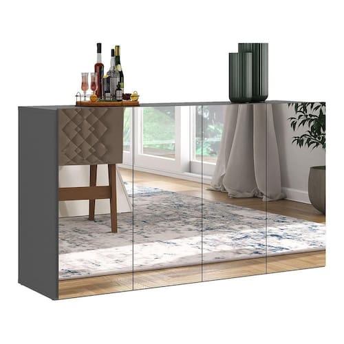 Acabamento: Finish Foil | Cor: Preto | Tonalidade: Preto | Material: MDP | Referência do Modelo: V1011 | Coleção: Vegas | Instruções de Cuidado: Limpar com pano seco para retirar o pó. Não utilizar produtos químicos ou abrasivos a limpeza. Não aplicar lustra móveis. | Sistema de Montagem: O produto acompanha manual de juntamente com kit ferragem. O produto será entregue desmontado e não disponibilizamos o serviço de montagem. | Produto Composto por: 1 aparador, 1 kit com 3 espelhos, manual de e kit ferragem. | Altura Montado: 69.50 | Largura Montado
