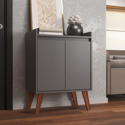 Conta com uma prateleira interna que amplia o espaço de armazenamento, mantendo livros, taças ou objetos decorativos sempre organizados e à mão.
