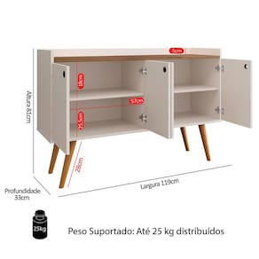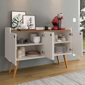 Ele conta com 4 portas, prateleiras internas e pés palito em madeira maciça, garantindo maior durabilidade ao produto. Também dispõe de um amplo tampo a qual pode ser utilizado para acomodar eletrodomésticos e itens decorativos.