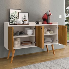 Ele conta com 4 portas, prateleiras internas e pés palito em madeira maciça, garantindo maior durabilidade ao produto. Também dispõe de um amplo tampo a qual pode ser utilizado para acomodar eletrodomésticos e itens decorativos.