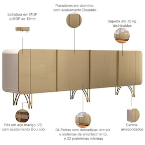 MDP | MDFO Buffet é um móvel essencial para sala de jantar! A peça é a principal chave que combina elegância e funcionalidade. Com 04 portas oferecendo amplo espaço para guardar louças, talheres e outros objetos. O design arredondado confere um toque de sofisticação e modernidade ao ambiente, enquanto os pés em aço com acabamento dourado adicionam um brilho e requinte especial. O Buffet Santiago para quem busca um móvel de qualidade extrema, acompanhado de muita beleza, e pensado para praticidade dos seus dias! Adquira agora o seu!